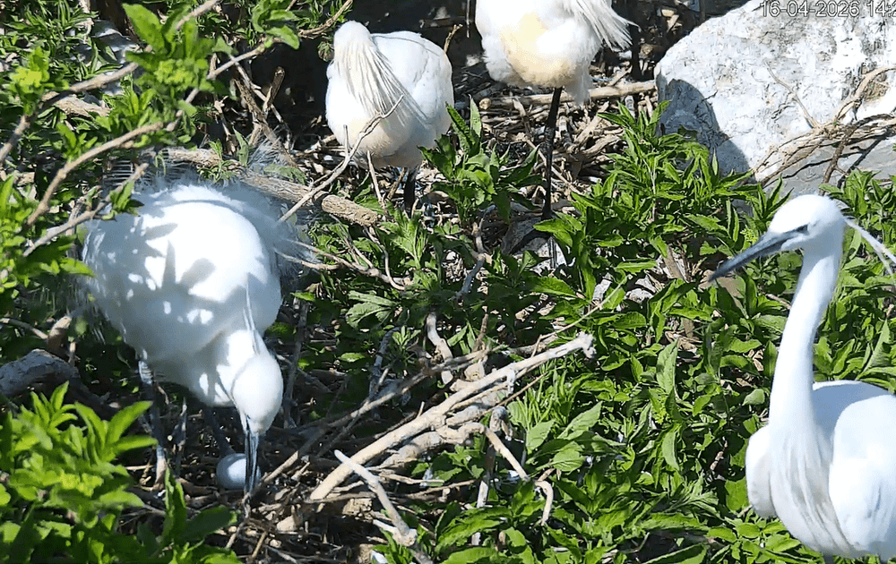 Vanmiddag werden we blij verrast, toen Camilla de camera naar de kleine zilverreiger toe draaide. Het paar had al een ei gelegd en was druk in de weer met het bouwen van het nest.