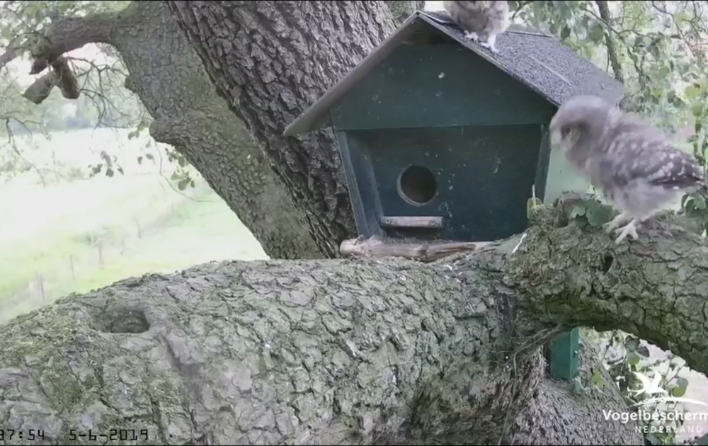 Voor het eerst vliegt een kuiken naar het dak van de nestkast, eigenlijk niet meer dan een sprongetje. Het andere kuiken springt over de "tanden" van de gevorkte tak voor de kast.