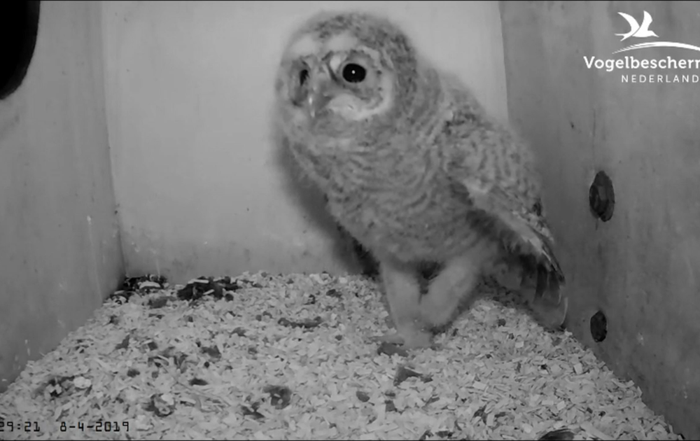 Het jonge bosuiltje nu met ring probeert op twee poten te staan, en maakt zich groot om door het vlieggat te kijken