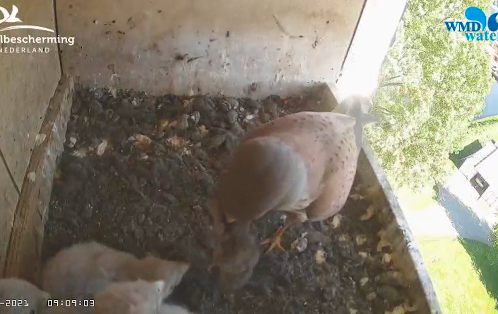 Een van de kuikens probeerde vannochtend zelf wat van de prooi te eten. De eerste stapjes richting zelfstandig eten.