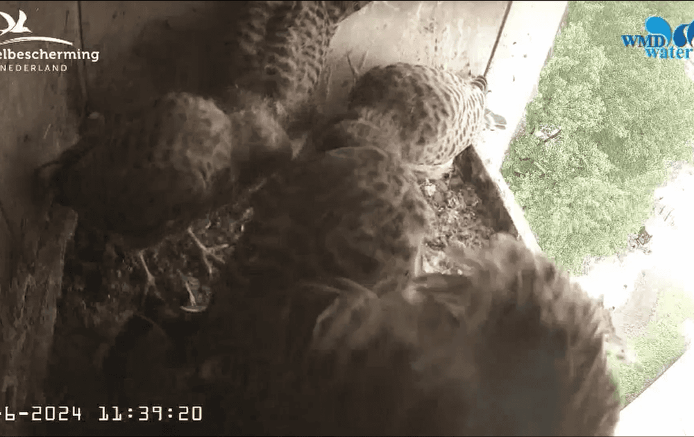 De prooien worden gelukkig weer regelmatig aangeleverd. Ouders voeren veelal buiten beeld, gezien de ruimte op het nest inmiddels beperkt is. Met gekibbel en getrek wordt er weer een prooi weggewerkt.