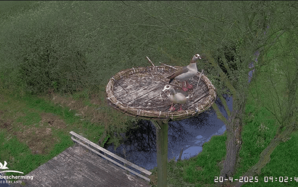 Twee nijlganzen tonen interesse in het nest. Ze hebben een niet alledaags gedrag.