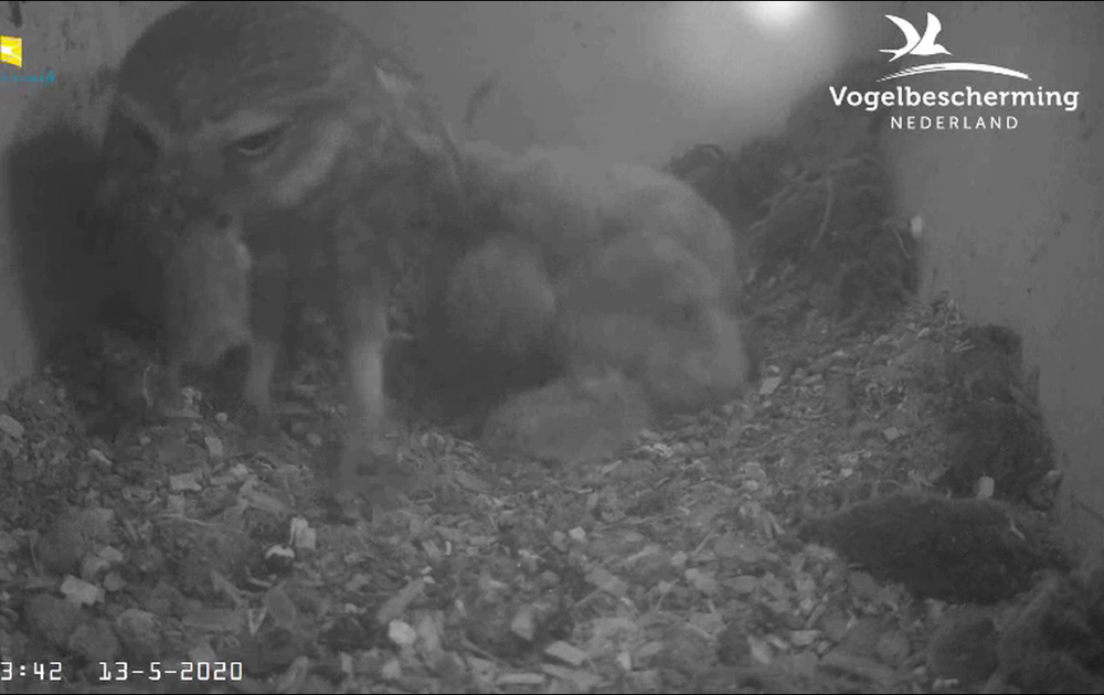 Vrouw steenuil doet aan voorraadmanagement. Na een voederbeurt verplaatst vrouw steenuil muisresten van achter naar voor in de nestkast.