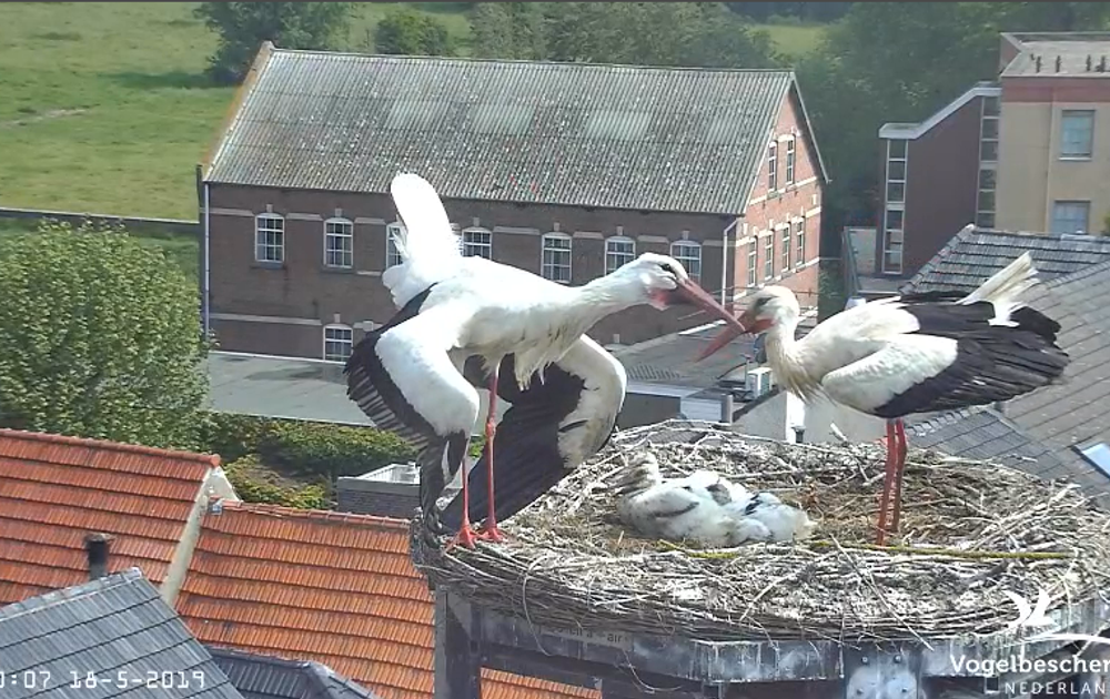 De kuikens groeien hard, en zijn zo groot dat ze vaker alleen kunnen blijven. Eerst zagen we dat Ma al langer wegbleef, en nu zijn de kuikens af aan toe helemaal alleen. Wonderbaarlijk is, dat als er gevaar dreigt, beide ouders snel aanwezig zijn.