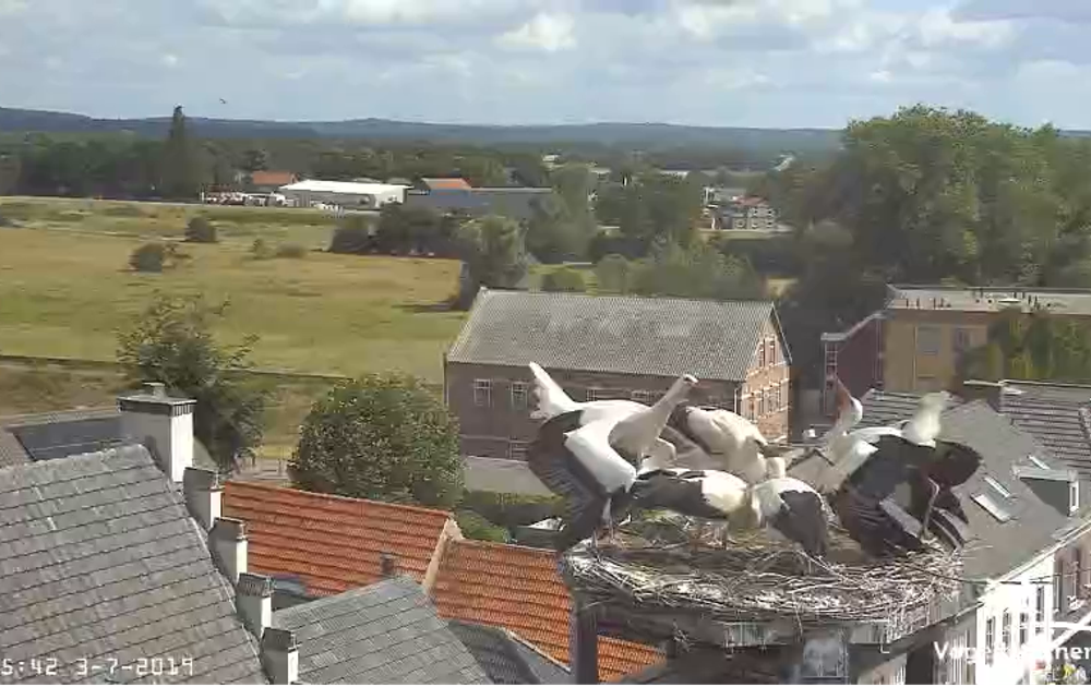 Twee kuuks zitten rustig op het nest. Dan komt Pa in opperste opwinding. De kuuk die uitgevlogen was, valt als het ware uit de lucht. Ook Ma verschijnt ten tonele. Het is schijnbaar een serieuze bedreiging die voorbij zweeft. Na een half uur laat die zich weer zien. Ma gaat er achter aan.