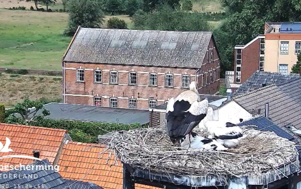 Als het erg warm is, beschermen Pa en Ma ooievaar de kuikens door als een parasolletje boven ze te gaan staan. Op deze clip is dat mooi te zien.