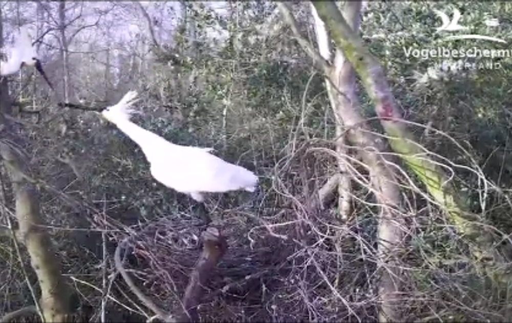 Man en vrouw lepelaar werken hier perfect samen. Man geeft de takken aan en vrouw verwerkt ze in het nest. Vanavond slaapt vrouw in het eigen nest en man zoekt het wat hogerop