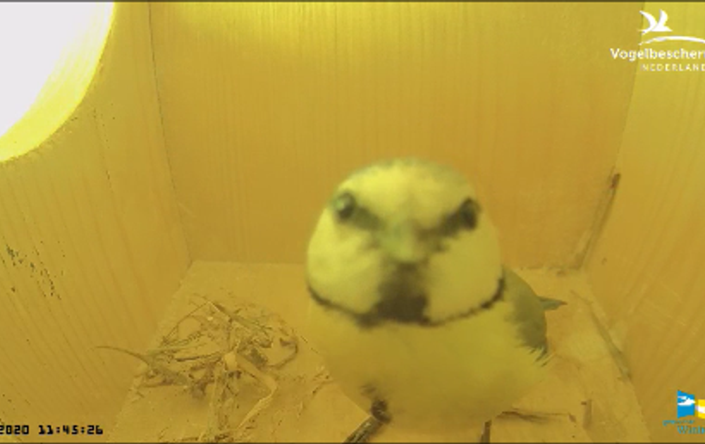 Al een aantal dagen is er een pimpelmees die steeds terugkomt in de kast. Er zijn al een aantal grondige inspecties geweest, maar is deze kast niet veel te groot voor zo'n klein vogeltje? Wie weet krijgen we wel kleine pimpelmeesjes te zien...