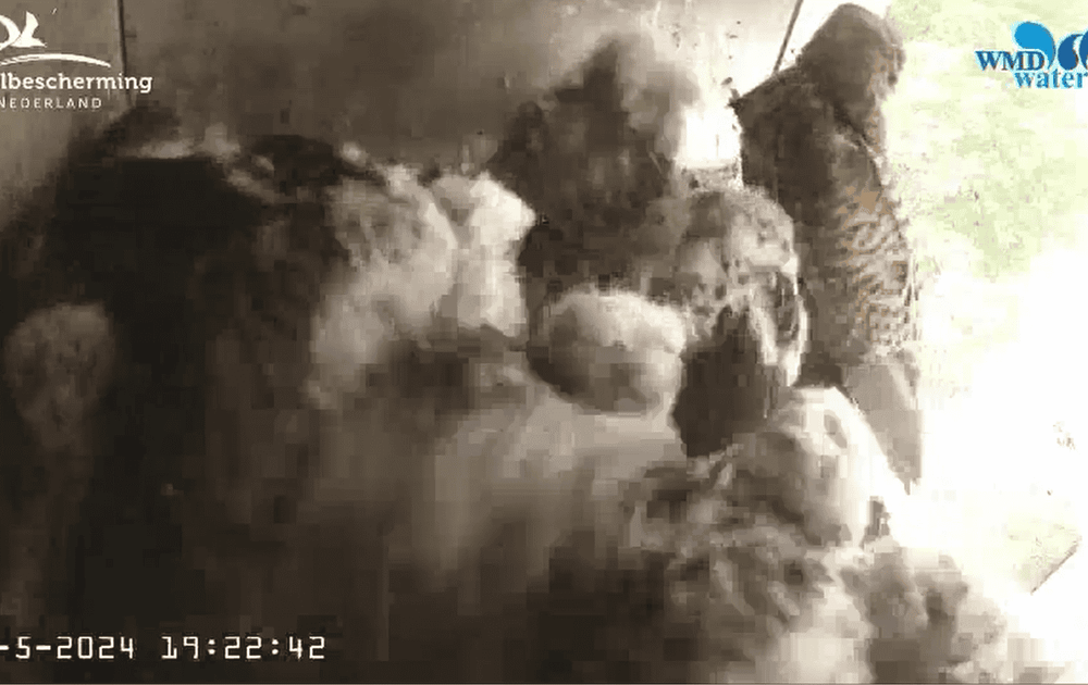 Zien jullie wie van de zeven hongerige jonge torenvalken de muis heeft ingepikt?