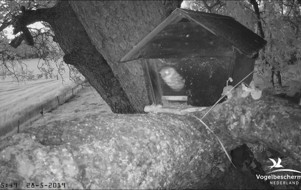 "Plop" is het geluid waarmee vrouw steenuil zich door het vlieggat worstelt, waarschijnlijk gehinders door en kuiken.
