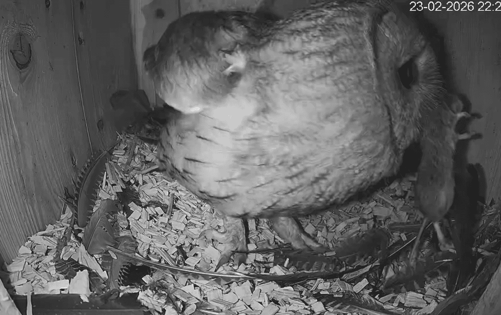 Man bosuil brengt een prooi in de kast. Dit doet hij om vrouw bosuil te tonen dat hij goed voor haar en het nest kan zorgen als ze eieren gaat leggen. Hoe meer prooien, hoe meer eieren zelfs.