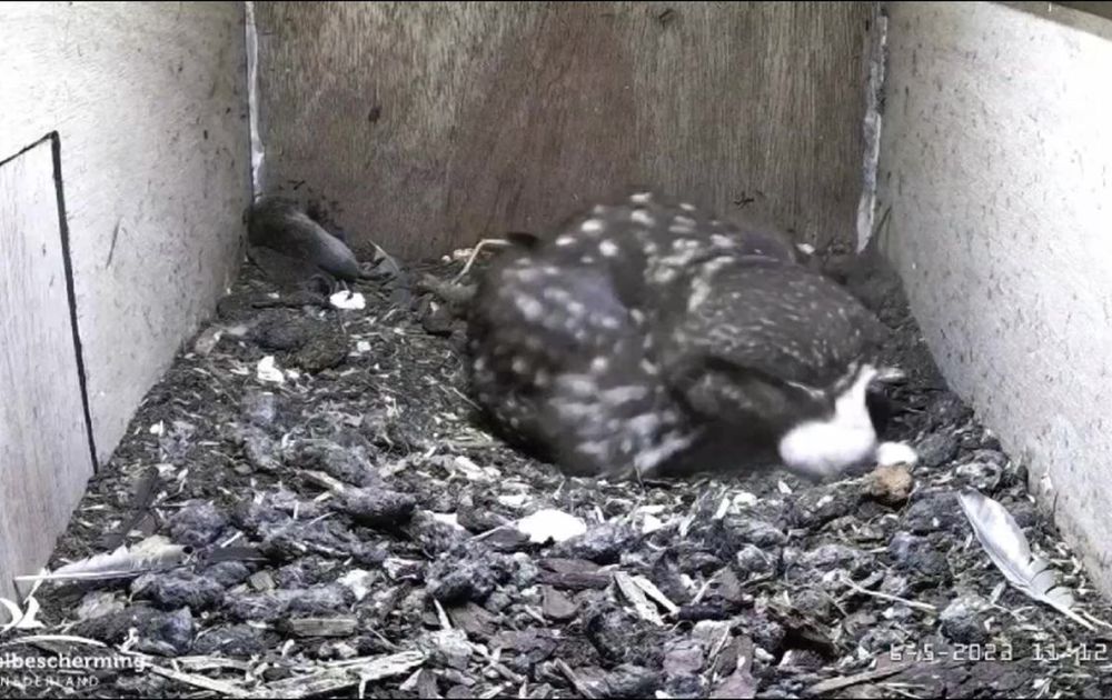 Vrouw steenuil activeert het eerste kuiken door het te prikkelen. Man assisteert.
