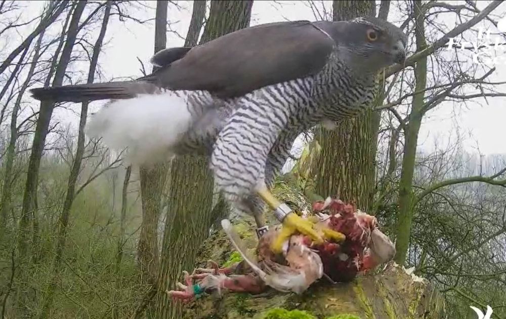 Op zaterdagochtend bracht het havikmannetje een prooi op de plukplaats. Deze werd hier gelijk overgedragen aan het vrouwtje, die er even later mee wegvloog. Zouden ze binnenkort wel op deze tak gaan plukken?