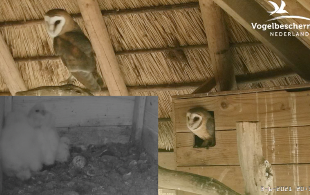Je zou denken dat iedereen gewend is dat man kerkuil er tegen de avond vandoor gaat. Maar toch. Deze keer hing er nog zo'n ontspannende sfeer in de nestkast, de kuiken waren rustig terwijl de ouders even fijn aan het kroelen waren. En dan opeens gaat man weg? En vrouw gaat vervolgens ook even een frisse neus halen? Ja dat vraagt natuurlijk om problemen, de kuikens protesteren!