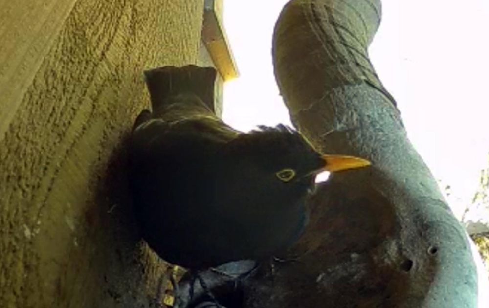 Anderhalf uur kijken bij de vijver, levert veel merels op! (De vijver ligt in dezelfde tuin als waar de schedel aan een schuurtje hangt)