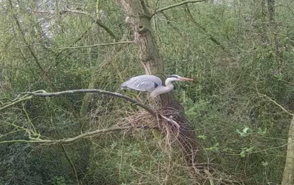 Op de nestcam komt vanmorgen een blauwe reiger (die ook in de Liede broeden) een takje halen.