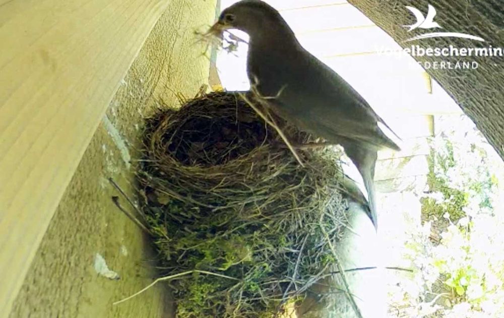 Na eerder in de week wat schoonmaak te hebben verricht, is vrouw Merel inmiddels weer volop bezig met de restauratie van het nest.