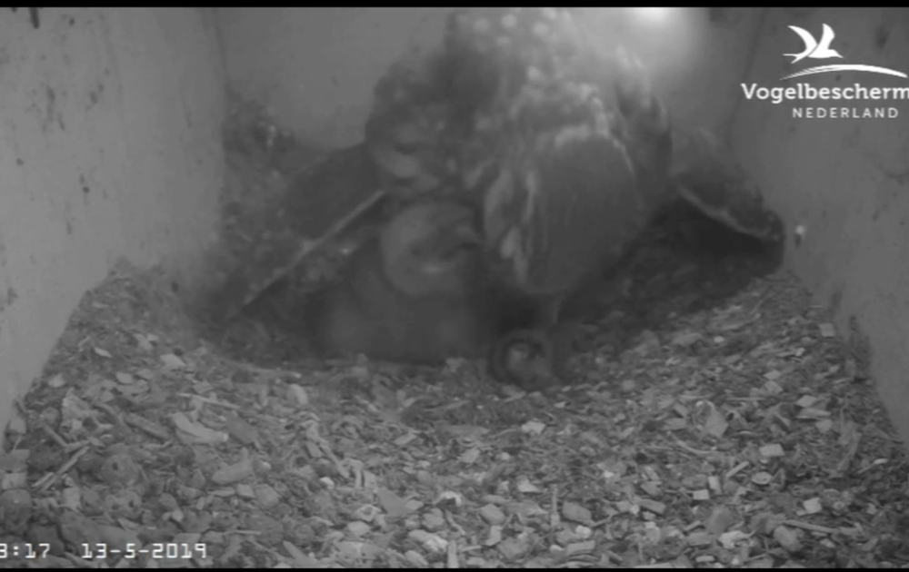 Moeder steenuil en de twee kinderen eten samen een ware muis voor een groot deel op. Het restje gaat keurig in de schuine koelkast.