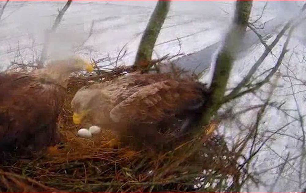 In de nanacht van 10 maart jaagt er steeds meer sneeuw over het nest. Het zeearendpaar is er niet van onder de indruk. Onder alle weersomstandigheden gaan ze onverstoorbaar door met broeden en het nest bijhouden.