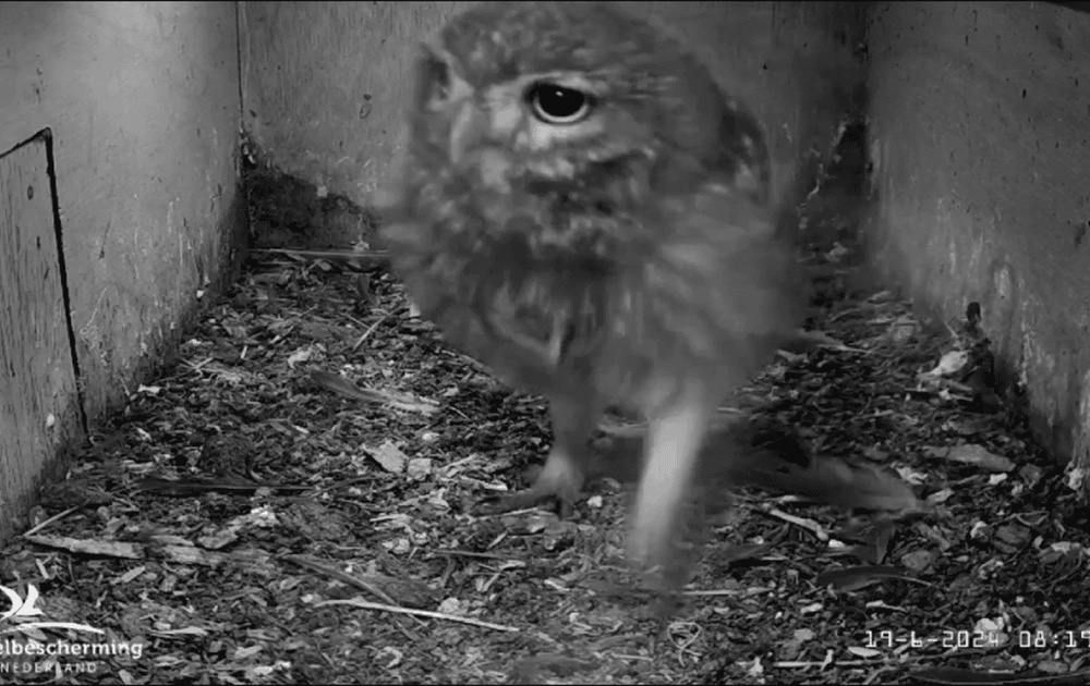 Het ongeringde kuiken BOS oefent in de nestkast om de omgeving scherp in het oog te krijgen.