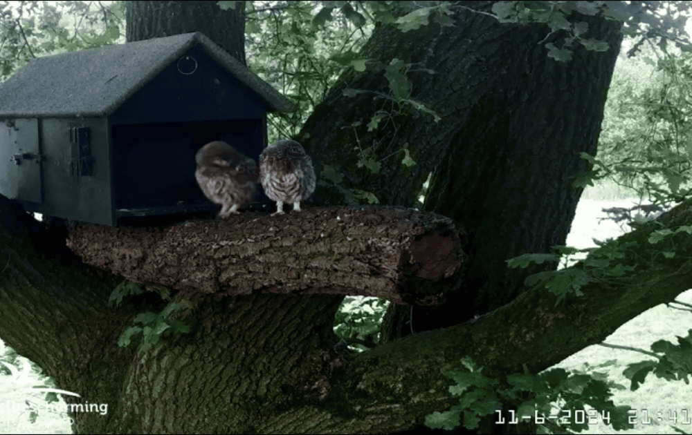 De twee kuikens BOS (Bewust Ongeringde Steenuil) en de rechtsgeringde RP (Rechtspoot) spelen voor de nestkast. Zou BOS een man zijn?