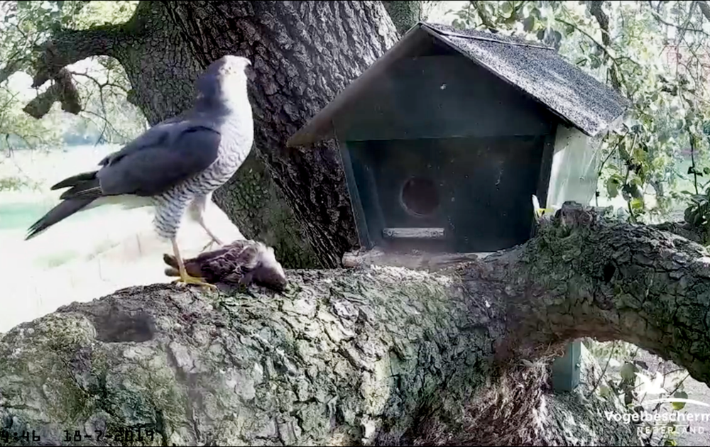 Een sperwervrouw verschijnt bij de steenuilenkast. Met een prooi, zeer waarschijnlijk een huismus.