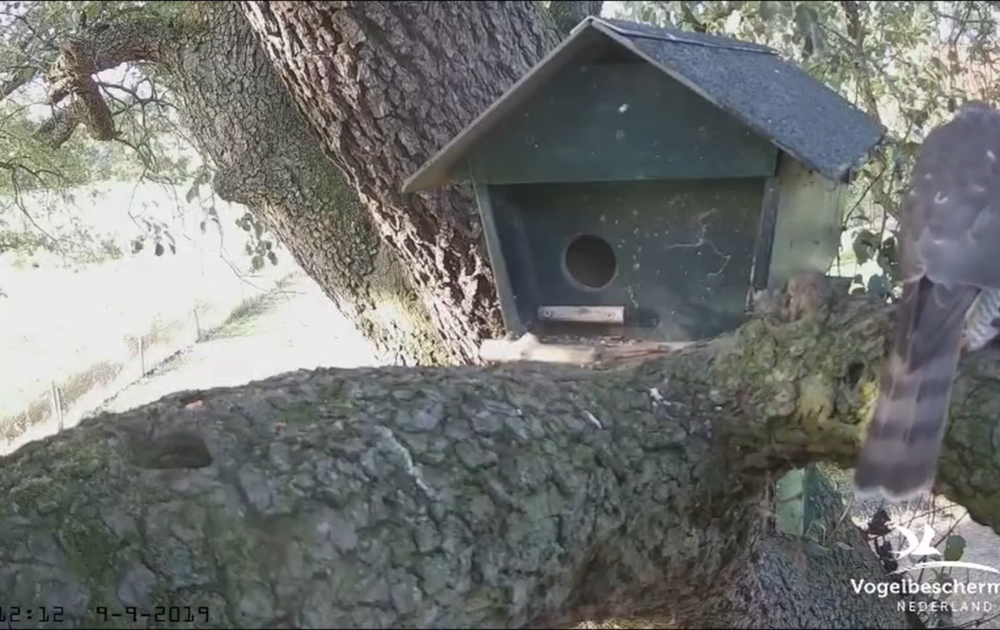 Voor de derde keer een sperwer in beeld bij de steenuilnestkast. Dit keer met een prooi, waarschijnlijk een mus. Waarschuwing voor angstaanjagend geluid.