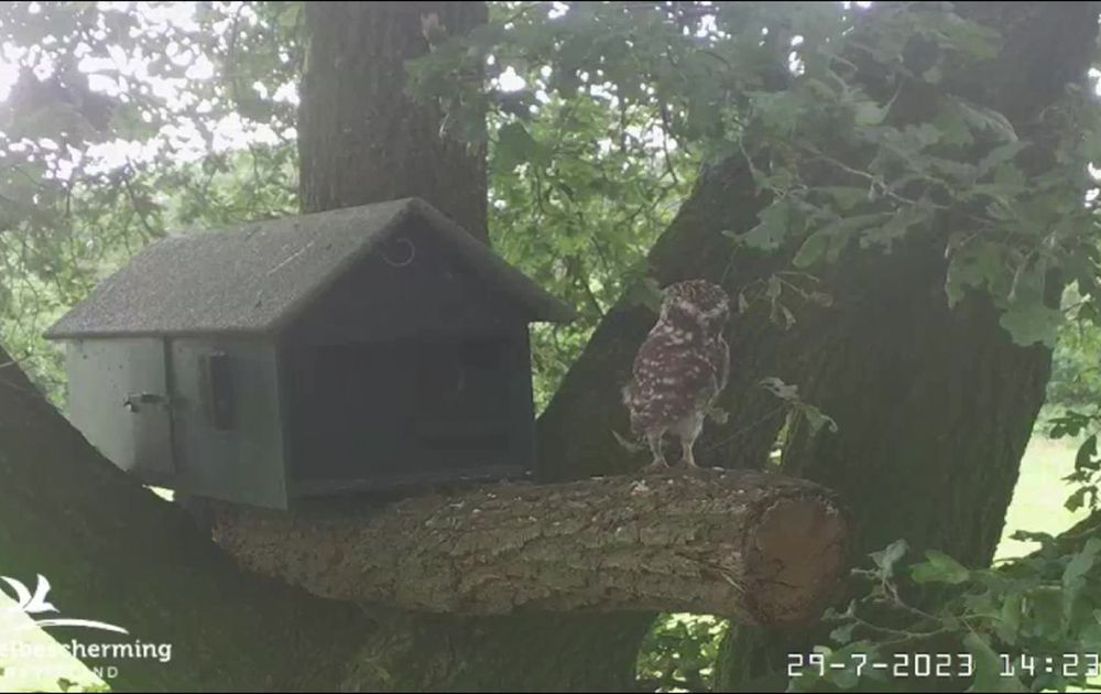 Vrouw sperwer was er in de vroege morgen van 29 juli. Vrouw steenuil kwam vlug nadat de sperwer wegging en was overdag in de nestkast, meestal met één jong. Man steenuil kwam weer eens in beeld. Jongen komen met eten in beeld, zelfgevangen?