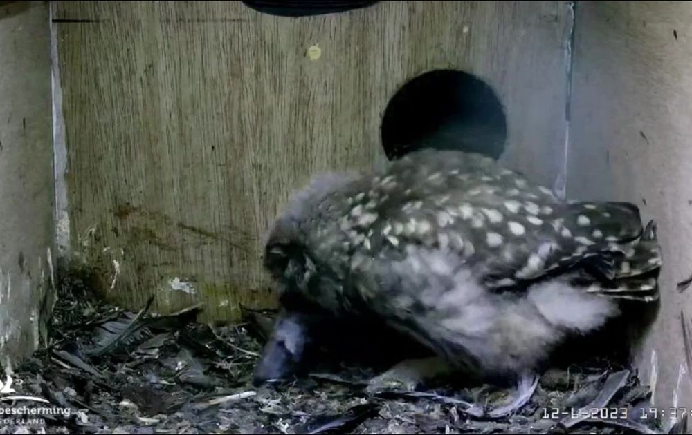 Steenuilen staan erom bekend dat ze niet graag spitsmuizen eten. Ze blijven vaak onaangeraakt liggen. Het kleinste kuiken stelde deze spitsmuis wel op prijs.