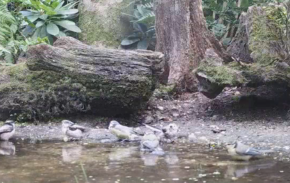 De familie staartmees neemt een bad.