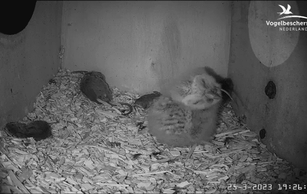 Vanavond even voor half acht een nieuwe stap in de ontwikkeling: zelf een muis pakken en opslokken. Tot de strot toe vol, misschien was het oog toch nog iets groter dan de maag.