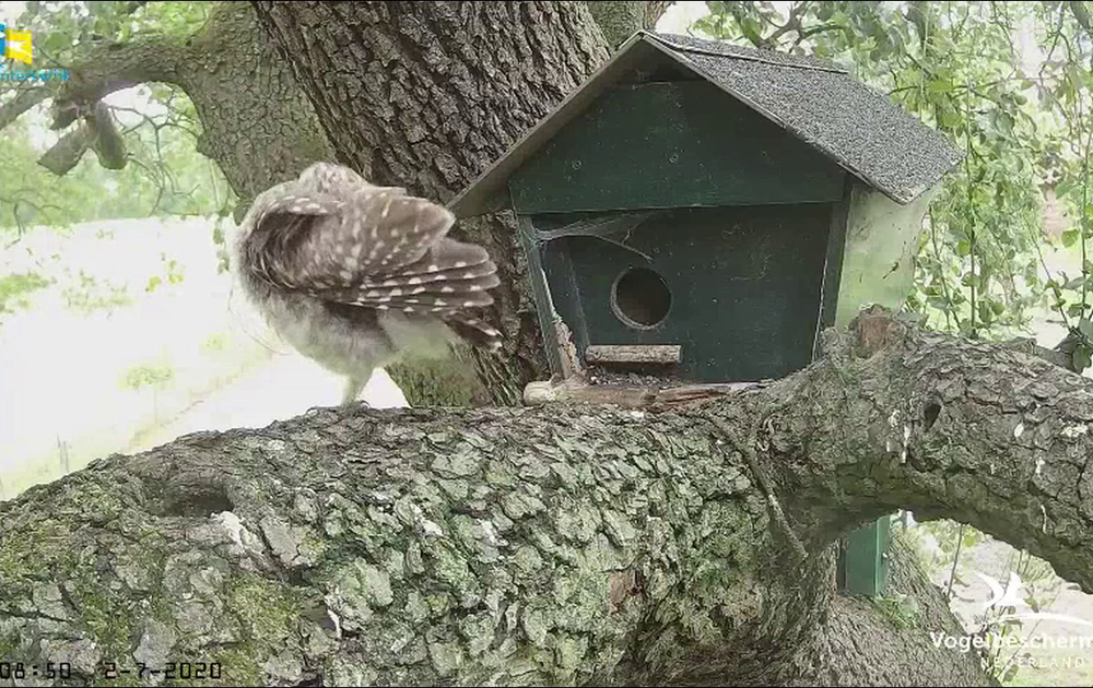 Rustige tijd voor onze steenuilen. In de buurt van de uilen o.a. een harige rups (plakker?), een groene specht, een haas en een kat.