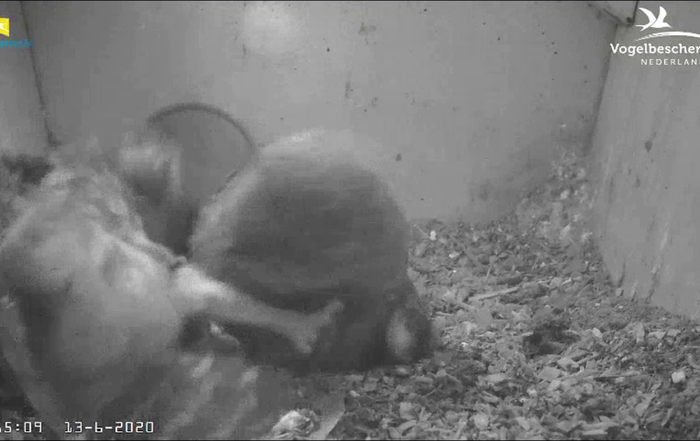 De twee jonge uiltjes BOS (ongeringd) en RP (rechtsgeringd) stoeien en knuffelen deze middag veel.