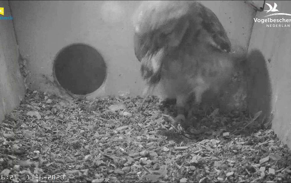 Het rechtsgeringde jong (Rechtspoot, RP) heeft een belegen muisje in de nestkast gevonden. Met moeite eet het jong het muisje in 30 minuten op.