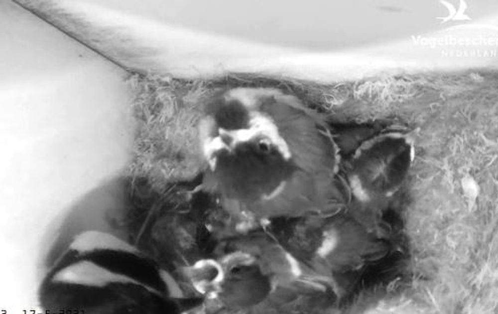 M komt tot tweemaal aan toe aanzetten met een iets te groot hapje voor de kuiken.