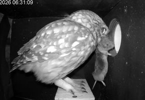 Man en Vrouw steenuil zijn lang nauwelijks in de nestkast geweest. Op 4 juli is Man voor de vierde keer kort in de nestkast en Vrouw inspecteert lang de nestkast. Willen ze de kast weer zelf gaan gebruiken?