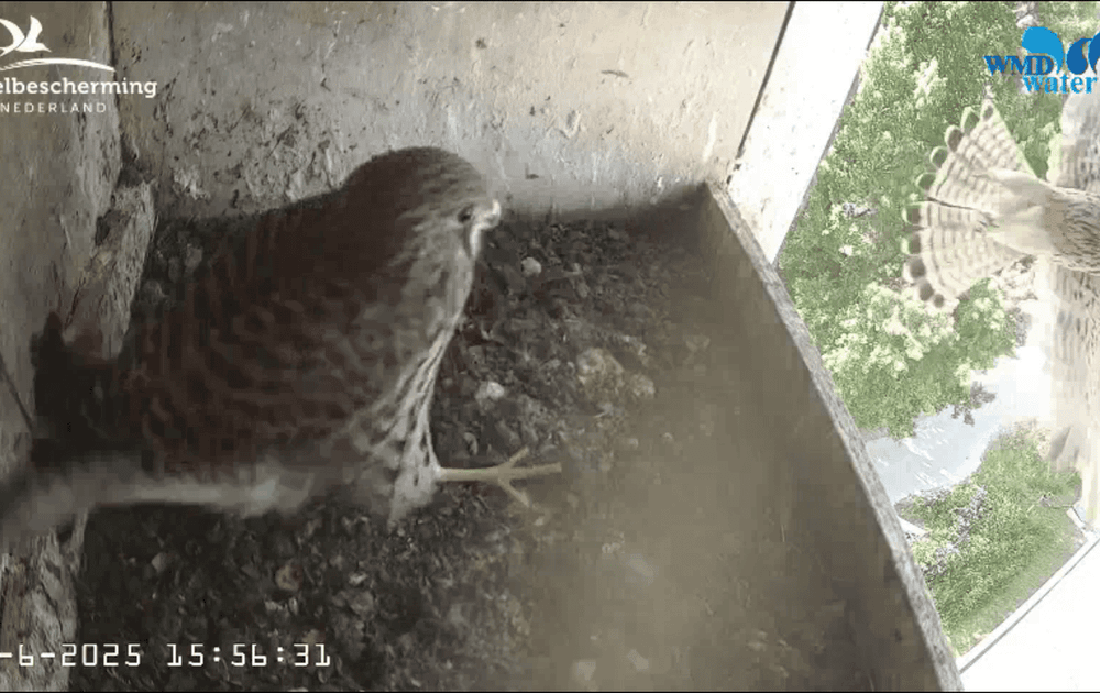 De jonge torenvalken spelen een spelletje Top Gun. De torenvalk in de kast gaat maar even een stukje achteruit...