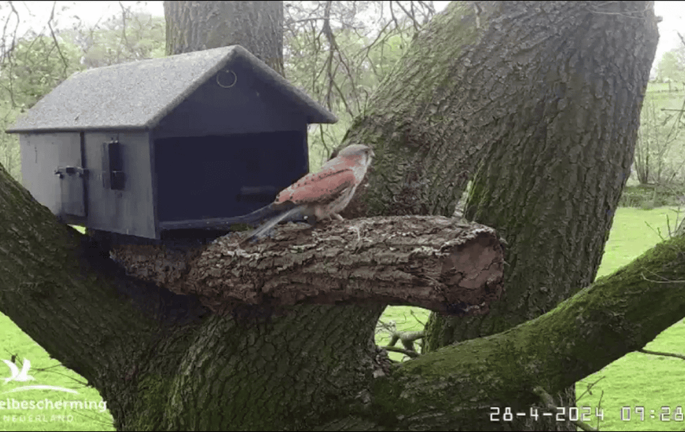 Een man Torenvalk brengt een bezoek aan de nestkast van de steenuil.