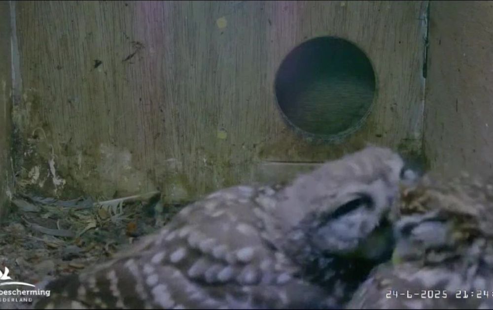 Het kuiken achtervolgt Vrouw steenuil de nestkast in. Het kuiken blijft fanatiek knuffelen/bedelen in de kast.