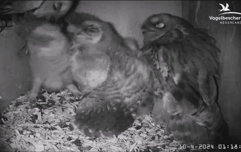 Het wordt helemaal een chaos als ook vrouw bosuil in de kast is om te voederen (lijster zo te zien) en man bosuil brengt een prooi. Een waar gevecht volgt.