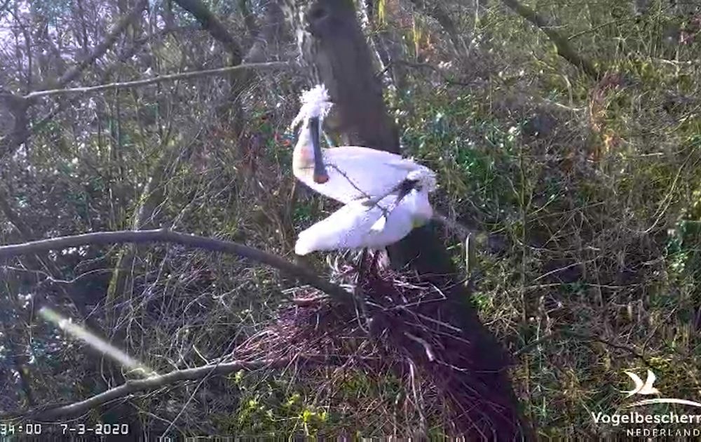 Verkenning van het nest en van elkaar, een beetje duwen en een beetje trekken aan de takken voor en na het paren.