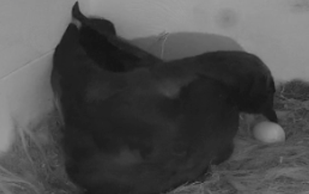 Het 2e eitje bij de kauwen; het ei komt net buiten de nestkom terecht, maar dat wordt binnen een paar minuten hersteld.