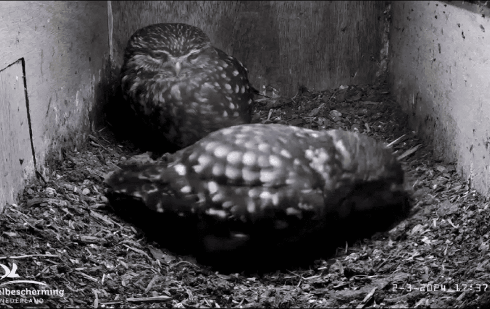 Eindelijk zijn man en vrouw steenuil overdag eens samen in de kast. Allogrooming (knuffelen), graven, kopstoten, kuiten bijten en communicatie-geluidjes.