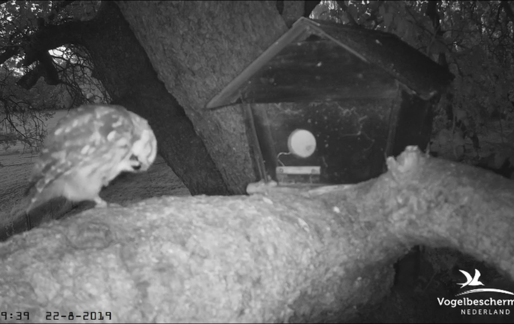 Vrouw steenuil was bijna 9 uur in de nestkast op woensdag 22 augustus. In de morgen vroeg at ze de resten van de vorige avond gevangen muis op.
