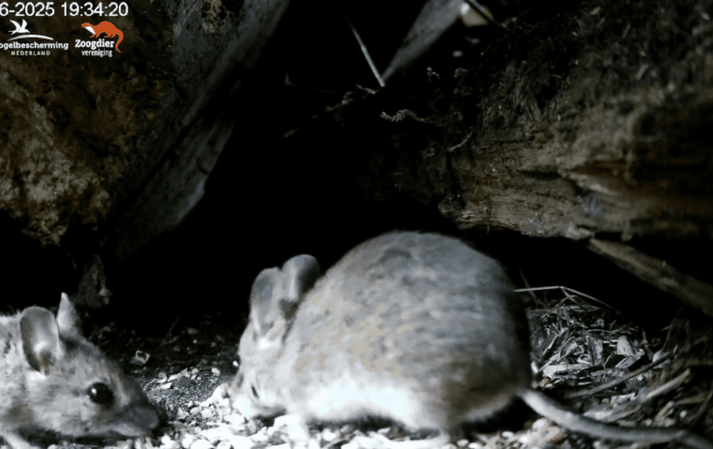 Eindelijk weer twee muizen tegelijk voor de camera, zonder dat ze zich rot schrikken of elkaar de tent uitjagen. Alhoewel...