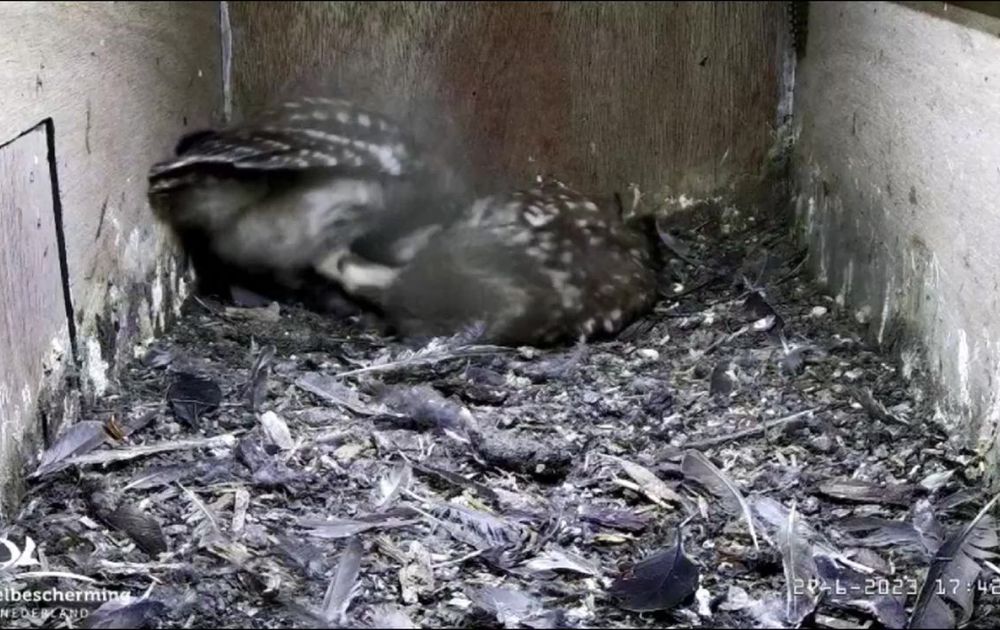 Twee jonge uiltjes zijn vaak samen in overdag in de nestkast. Ze zijn meestal erg vreedzaam aan het slapen. Met als training soms een partijtje stoeien.