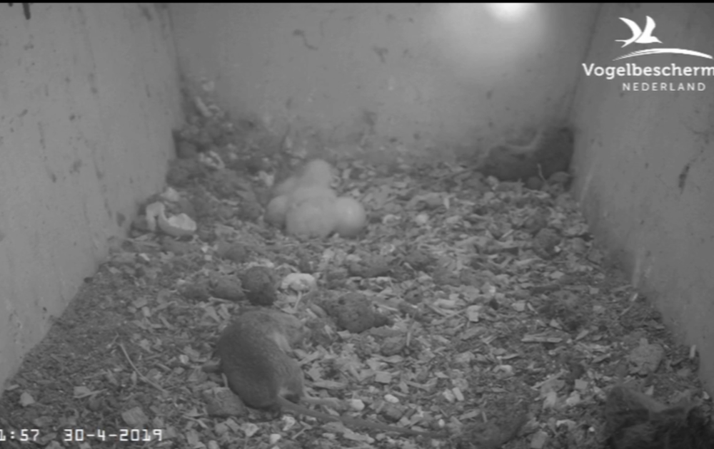 Om 19:57u haalt vrouw een volgende grote eirschaal onder zich vandaan. Aan het piepen is ook te horen dat er twee kuikens zijn.