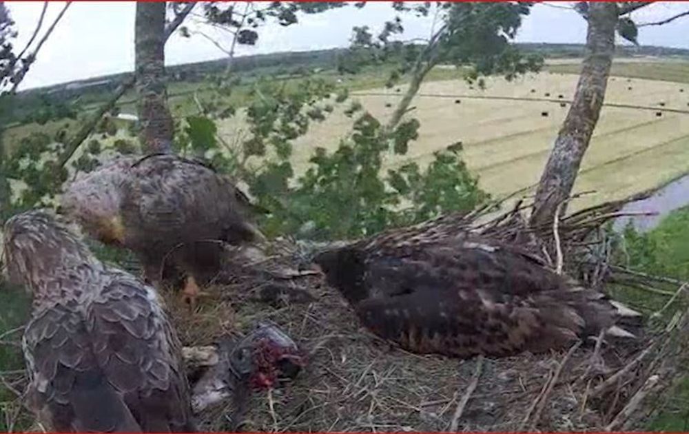 Het overblijvende zeearendjong is een beetje lui geweest in vergelijking met het brusje dat gisterochtend wegvloog.