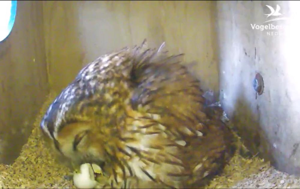 Vannacht zien we al dat vrouw bosuil één van de ingedroogde eieren pakt en op eet. 'Birdie', die elke nacht kijkt, meldde dat al. Vanochtend rond 07:41 uur pakt v. het tweede gedeukte ei en eet dat ook op. Beide eieren hadden geen nut meer.
