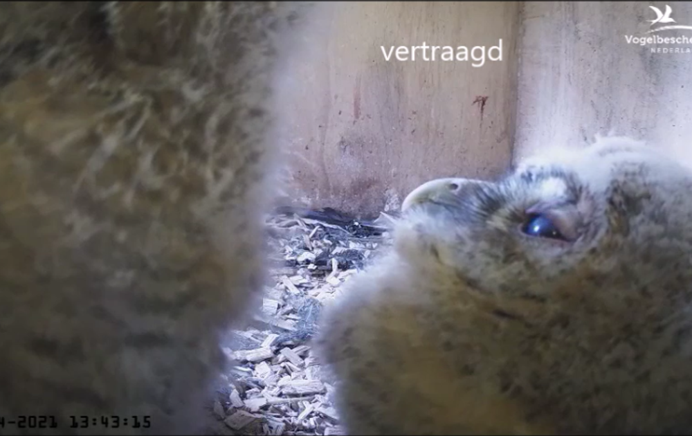De kuikens zitten gelukkig ook wel eens voor de lens, waarbij je meer kunt zien dan alleen maar hun dons. Birdslover attendeerde me op het kijken van het ene kuiken naar het andere. Ah.....een mooi moment om eens goed naar het functioneren van een uilenoog te kunnen kijken.